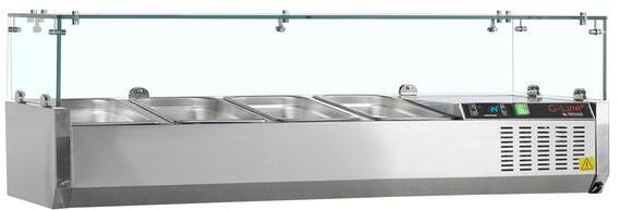 A GVC pultvitrin hűtők nagyszerű kiegészítői a gasztro pultoknak, minden előkészítő alapanyag könnyen elérhető. GN1/4 és GN1/6 edényeket fogad (nem tartozék). SS201 rozsdamentes acélból, üveg védőtetővel az ételek védelmére. Ideális pizzériákba, gyorséttermekbe, szendvicsbárokba.